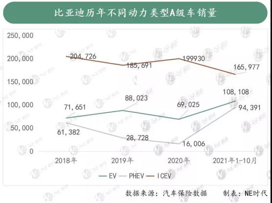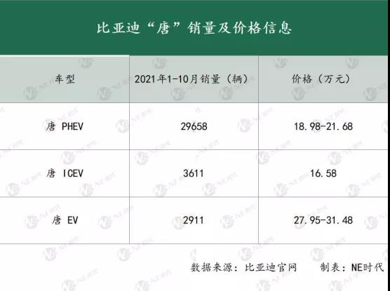 而这将近10万的A级PHEV车型中,有89326台是比亚迪DMI车型,其中秦Plus 55070辆,宋Plus 34256辆。 以秦Plus为例,作为一款标准的A级车,除了可以汽油驱动,还提供55km和120km的纯电续航,但是补贴后的售价只有10.58-14.58万元,这种车放在目前的燃油车市场跟很多车型相比也非常有优势,更何况还是一款PHEV车型。10个月创造5.5万销量非常合理。 还有一款比较典型的就是宋Plus,插混版前十个月销量比燃油版还多出将近900台。前者价格区间在14.68-19.98万元,后者11.58-14.38万元之间,就汽车保险数据来看,插混版本主要起量的是14-16万之间的这两款,这跟燃油版的高配版差价非常小,所以在价格上还是非常有优势的。 不仅是A级车,在比亚迪体系里面,B级车唐PHEV低配版与燃油版车型价差也拉得很近,并且以高性价比完胜EV版销量。