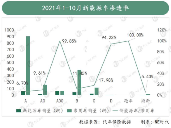 据汽车保险数据显示,目前整个乘用车市场以A、B、A0、C、A00级车为主。 以今年前十个月的销量来看,这些主流级别车型中,新能源车渗透率最高的还是A00级车型,其他级别车型的电动化替代空间基本都在90%以上。A级车作为乘用车市场体量最大的一部分,也是目前电动化转型压力最大的一个市场。