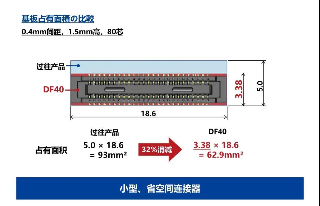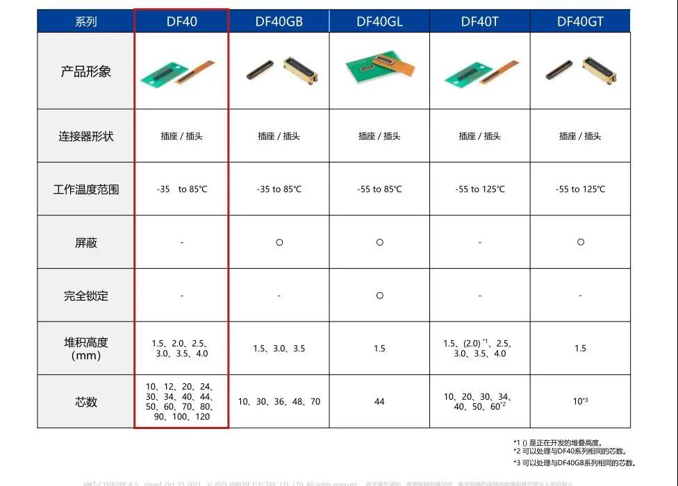 7. 种类繁多(带护罩:DF40G系列,带完全锁:DF40GL系列,ADAS:DF40T系列) 8.核心数量从10到120核心变化巨大 9.用导向肋确保自动对准:0.33mm 10.防止镍阻挡层焊接的结构 11.还提供用于生产线检查的高度耐用的连接器* 只有H=1.5 mm的产品支持Type-C