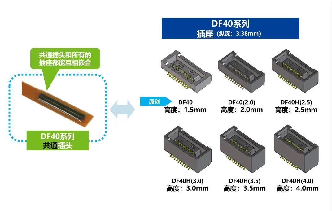 特点 1. 省空间:纵深3.38mm 2. 堆叠高度 1.5-4.0mm 3. 对应USB4 Gen.2(10Gbps)信号传输 *1 4. 有效嵌合长度长:0.45mm 5. 卓越的端子构造实现了明确的锁扣手感以及大嵌合力 6. 防止端子变形构造 7. 种类繁多(带护罩:DF40G系列,带完全锁:DF40GL系列,ADAS:DF40T系列) 8.核心数量从10到120核心变化巨大 9.用导向肋确保自动对准:0.33mm 10.防止镍阻挡层焊接的结构 11.还提供用于生产线检查的高度耐用的连接器* 只有H=1.5 mm的产品支持Type-C DF40系列变体